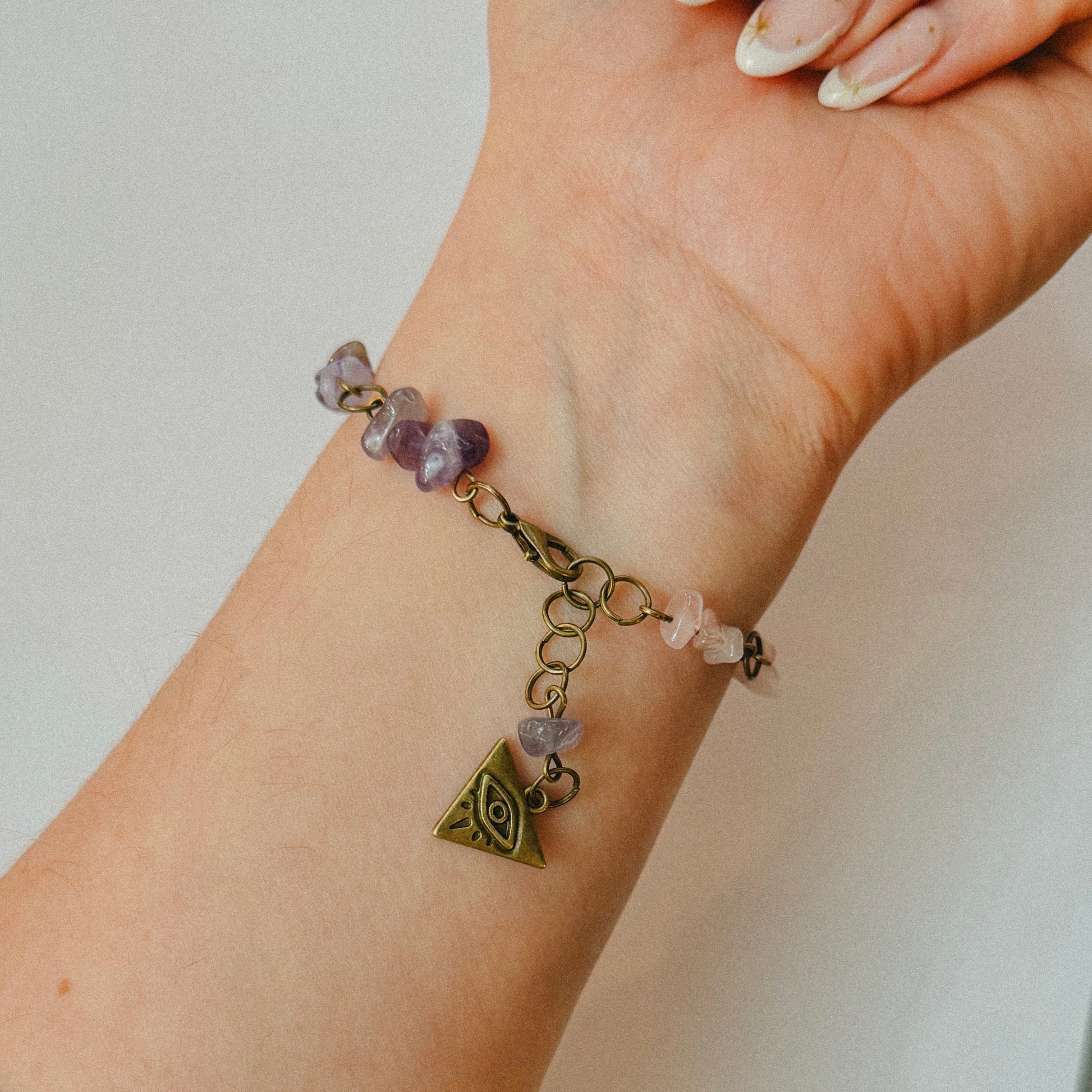 This beautiful handmade crystal chip charm bracelet has been thoughtfully created to support balance, protection and emotional wellbeing. Each bracelet features a unique mix of natural rose quartz and amethyst chips, making every piece truly one of a kind